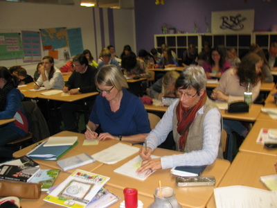 Um erste Ideen für Projekte und Aktivitäten an der eigenen Schule zu sammeln nutzen die anwesenden Teilnehmerinnen und Teilnehmer die Mind-Map-Methode „Schneeball“. In der ersten Runde schreibt jeder für sich sechs eigene Ideen und Anregungen auf jeweils einen Zettel. Nun setzen sich die Teilnehmerinnen und Teilnehmer in Zweierteams mit den Ideen auseinander und einigen sich auf sechs bis acht Aspekte, die ihnen am wichtigsten erscheinen. Schließlich trifft man sich in Viererteams, um die entstandenen Anregungen zu beraten. Man einigt sich auf sechs Aspekte, welche mit dickem Filzstift auf jeweils eine Moderationskarte notiert werden.